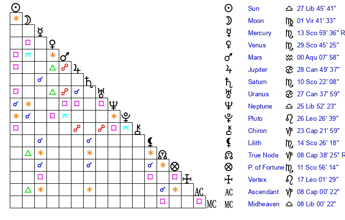 | Sun | 27 Libra 45 | 28 Libra 33 | 9 Capricorn 29 |