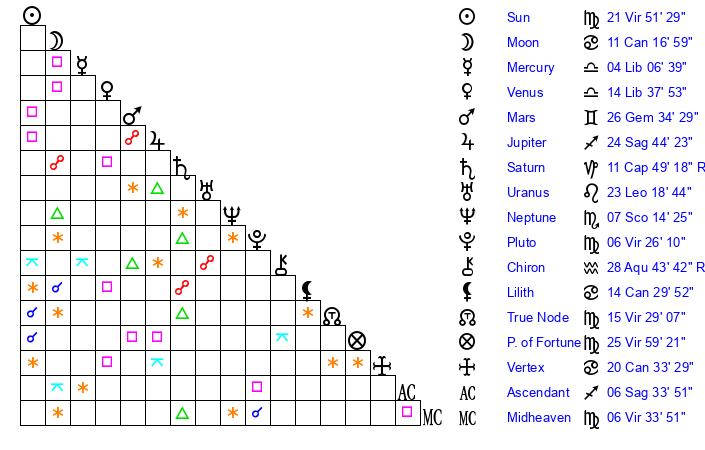 | Pluto | 6 Virgo 26 | 1 Aquarius 33 | 8 Virgo 0 |