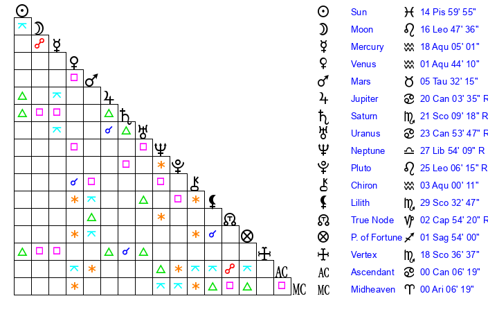 | Sun | 14 Pisces 59 | 16 Pisces 1 | 23 Taurus 44 |