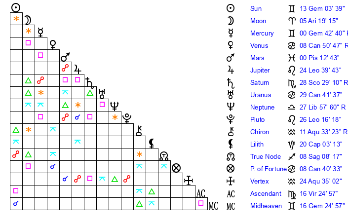 | Sun | 13 Gemini 3 | 13 Gemini 22 | 18 Leo 58 |