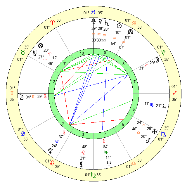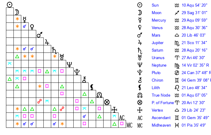 | Moon | 29 Sagittarius 36 | 10 Pisces 40 | 24 Aries 32 |