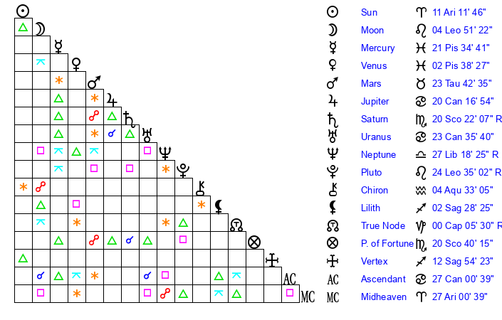 | Saturn | 20 Scorpio 53 | 24 Pisces 29 | 16 Scorpio 11 |