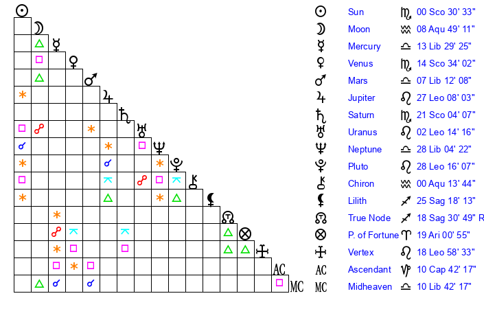 | Neptune | 28 Libra 4 | 29 Pisces 56 | 0 Scorpio 10 |