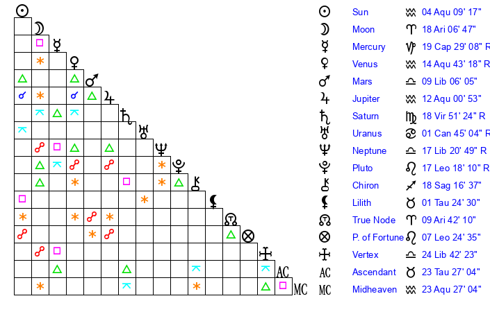 | Moon | 18 Aries 5 | 6 Sagittarius 16 | 22 Capricorn 2 |