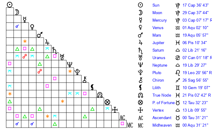 | Venus | 1 Aquarius 3 | 18 Capricorn 54 | 4 Taurus 0 |