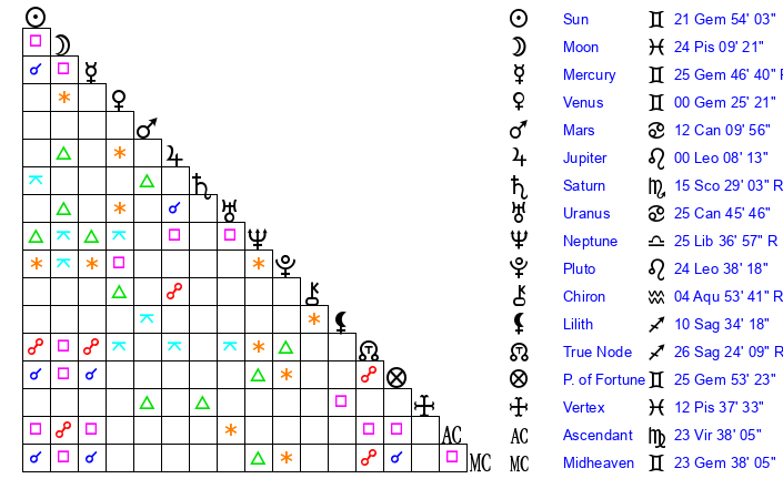 | Mercury | 25 Gemini 46 | 9 Cancer 14 | 14 Virgo 33 |