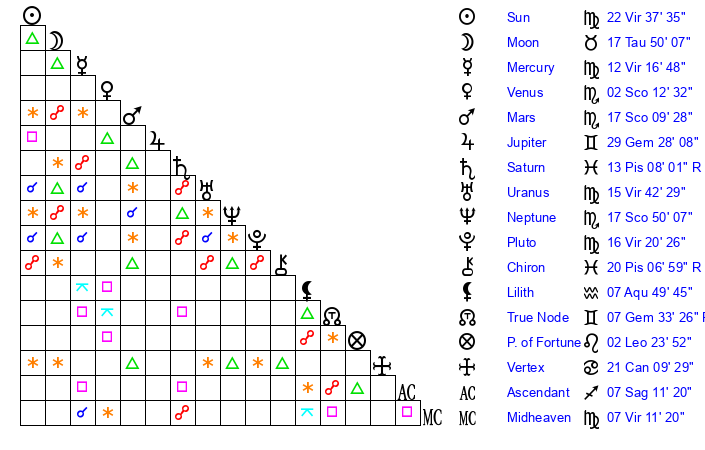 | Sun | 22 Virgo 38 | 23 Virgo 6 | 22 Scorpio 7 |