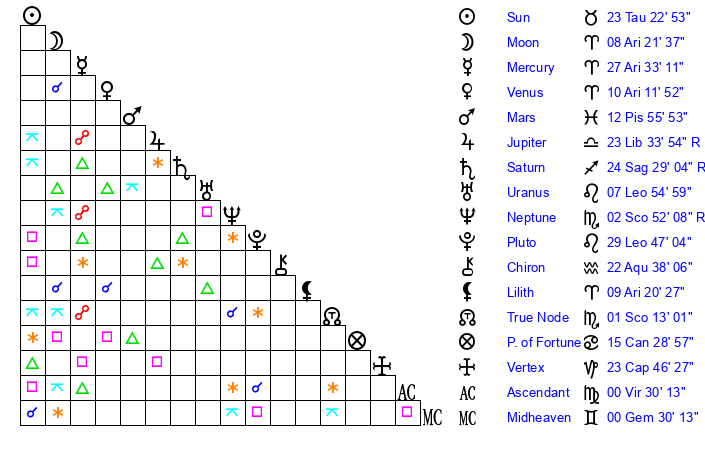 | Neptune | 2 Scorpio 51 | 1 Aries 29 | 2 Scorpio 0 |