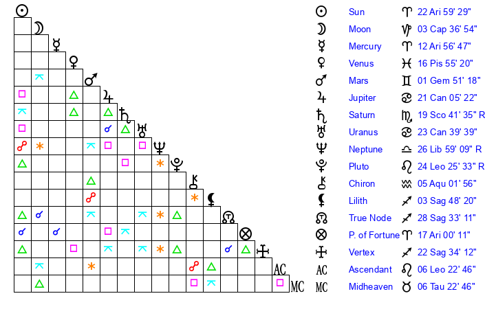 | Sun | 22 Aries 59 | 24 Aries 1 | 0 Cancer 29 |