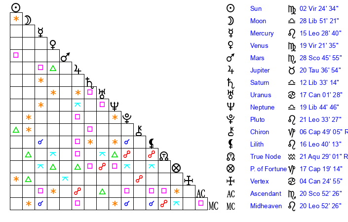 | Sun | 2 Virgo 24 | 2 Virgo 45 | 14 Scorpio 14 |