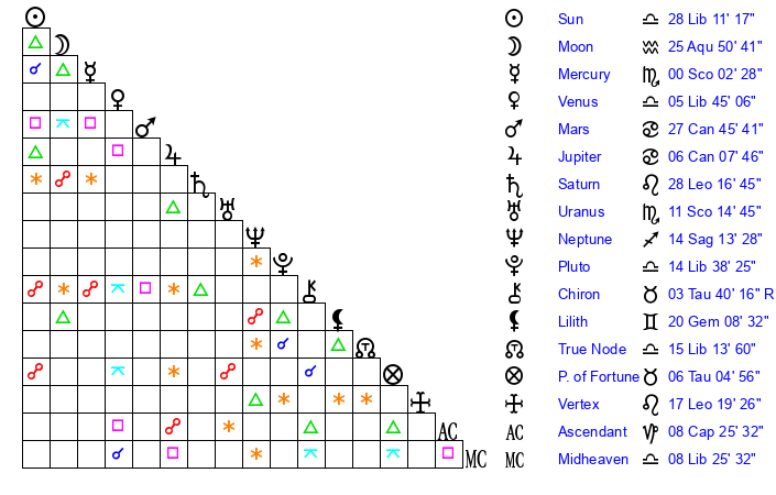 | Venus | 5 Libra 45 | 9 Libra 43 | 5 Sagittarius 50 |