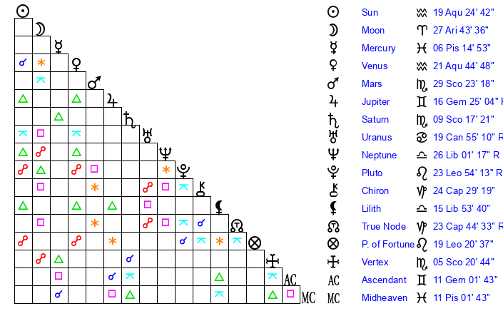 | Neptune | 26 Libra 1 | 28 Pisces 12 | 24 Libra 32 |