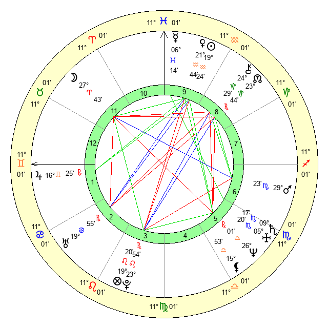 | Moon | 27 Aries 40 | 3 Cancer 23 | 27 Scorpio 3 |