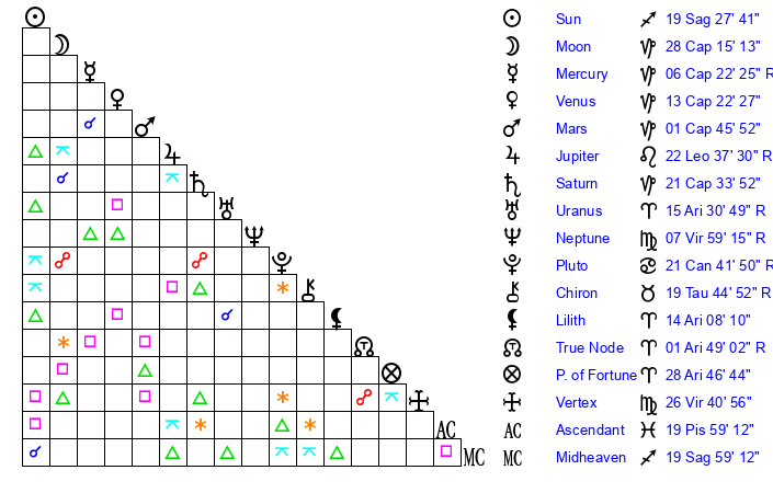 | Moon | 28 Capricorn 18 | 27 Virgo 22 | 23 Gemini 43 |