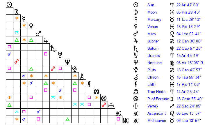 | Sun | 22 Aries 48 | 24 Aries 1 | 23 Cancer 11 |