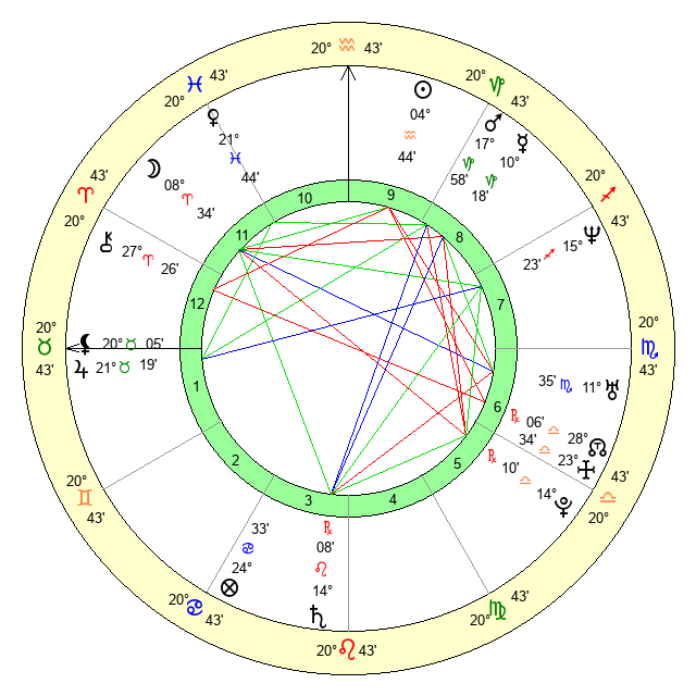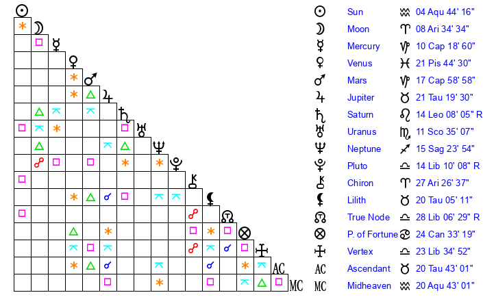 Sun | 4 Aquarius 44 | 5 Aquarius 5 | 23 Pisces 8 |