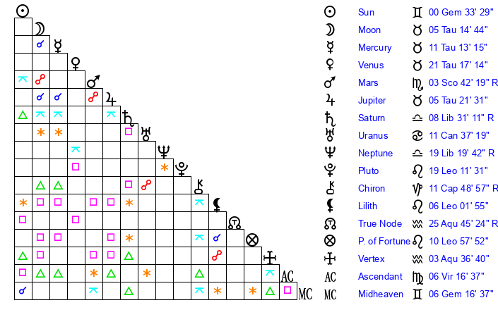 | Moon | 5 Taurus 7 | 16 Pisces 12 | 26 Sagittarius 38 |