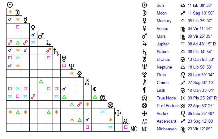 | Moon | 11 Sagittarius 14 | 22 Pisces 50 | 23 Leo 35 |