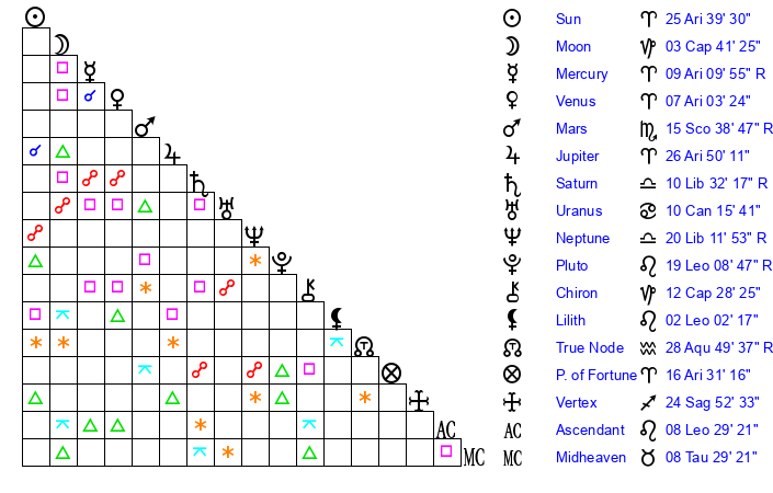| Moon | 3 Capricorn 41 | 25 Scorpio 10 | 4 Virgo 19 |