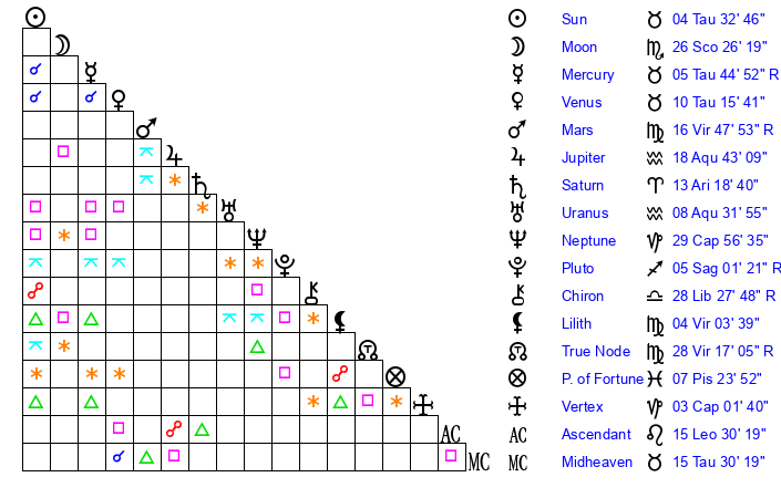 | Venus | 10 Taurus 16 | 27 Pisces 7 | 14 Gemini 44 |