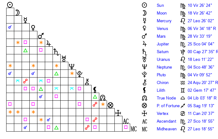 | Mercury | 27 Leo 26 | 2 Virgo 12 | 8 Sagittarius 3 |