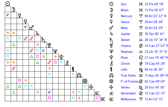 | Neptune | 23 Libra 16 | 29 Pisces 24 | 21 Libra 28 |