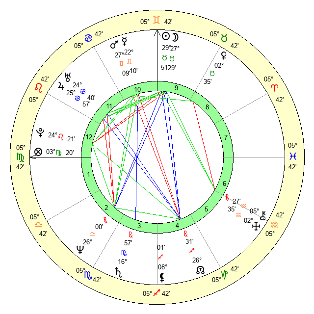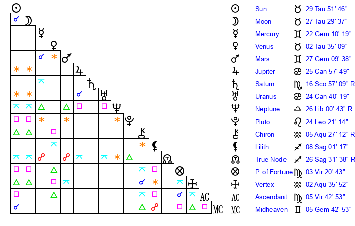 | Sun | 29 Taurus 51 | 0 Gemini 53 | 6 Leo 45 |