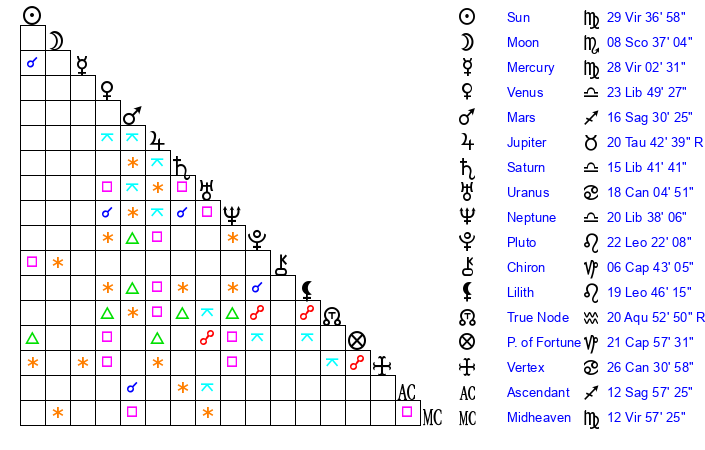 | Moon | 8 Scorpio 41 | 9 Libra 47 | 19 Cancer 39 |