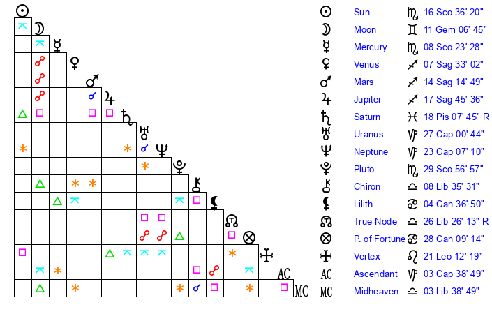 Sun | 16 Scorpio 36 | 17 Scorpio 35 | 15 Sagittarius 55 |