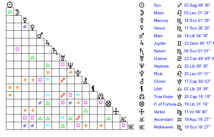 | Mars | 14 Libra 54 | 15 Sagittarius 23 | 27 Scorpio 42 |