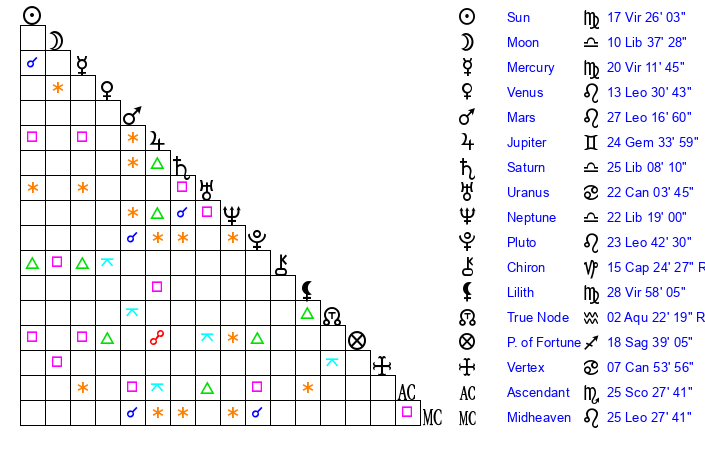 | Sun | 17 Virgo 26 | 18 Virgo 0 | 28 Scorpio 50 |