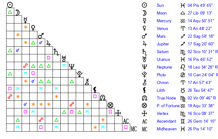 | Sun | 4 Pisces 50 | 6 Pisces 20 | 13 Gemini 46 |