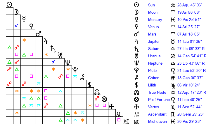 | Pluto | 21 Leo 53 | 2 Aquarius 34 | 20 Leo 47 |
