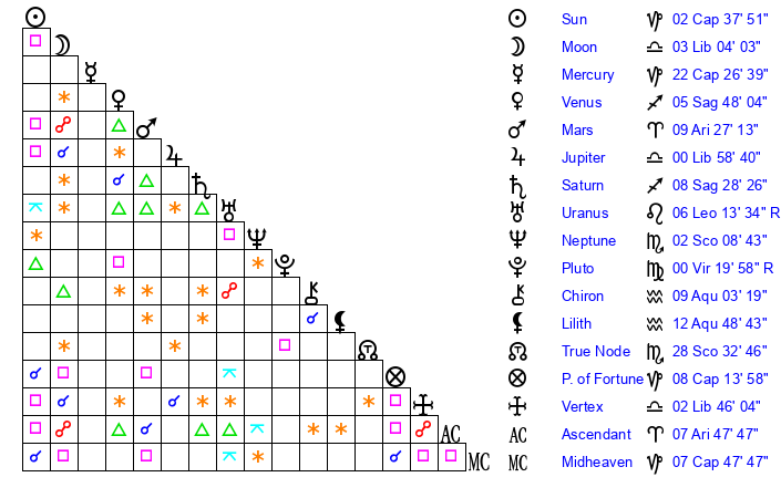 | Moon | 2 Libra 57 | 22 Aquarius 32 | 2 Aries 19 |