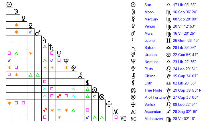 | Moon | 16 Scorpio 43 | 7 Gemini 2 | 14 Cancer 52 |