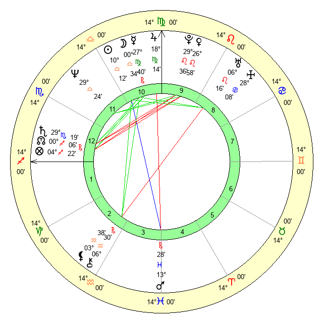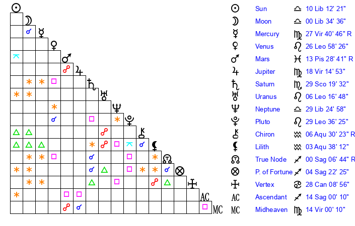 | Venus | 26 Leo 58 | 17 Virgo 6 | 19 Scorpio 39 |