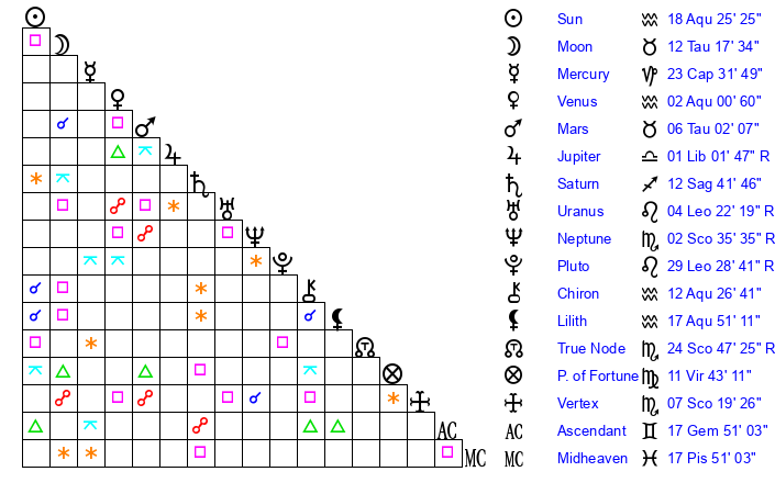 | Moon | 12 Taurus 18 | 16 Gemini 22 | 21 Scorpio 38 |