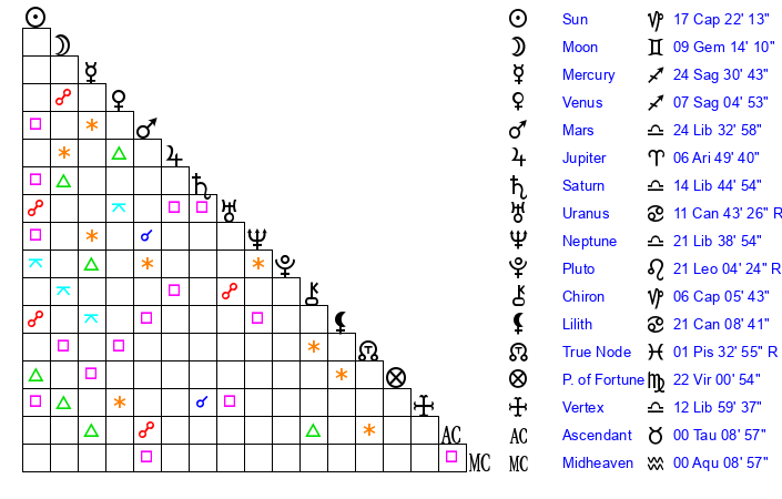 | Neptune | 21 Libra 39 | 27 Pisces 25 | 20 Libra 52 |
