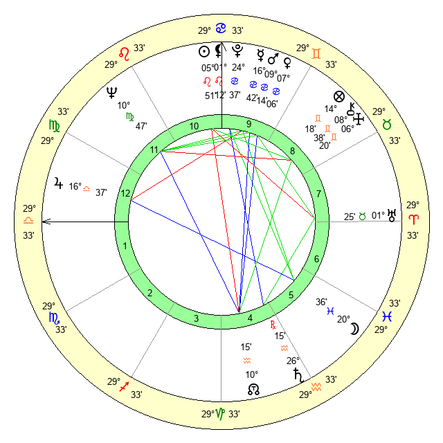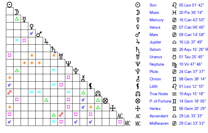 | Moon | 20 Pisces 35 | 5 Libra 49 | 16 Cancer 51 |