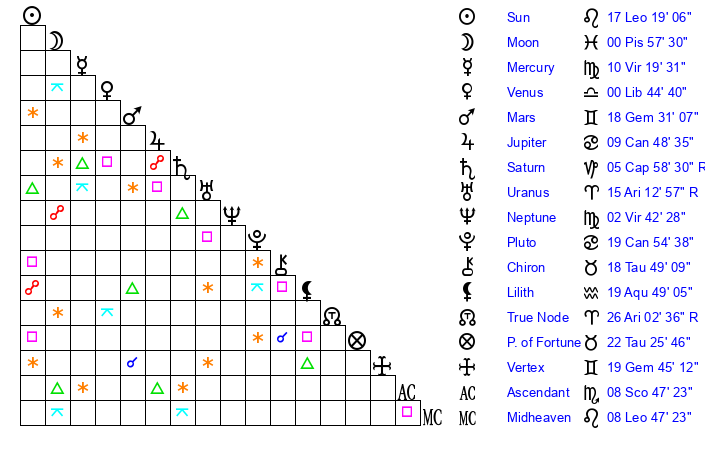 | Moon | 1 Pisces 0 | 5 Pisces 50 | 22 Leo 59 |