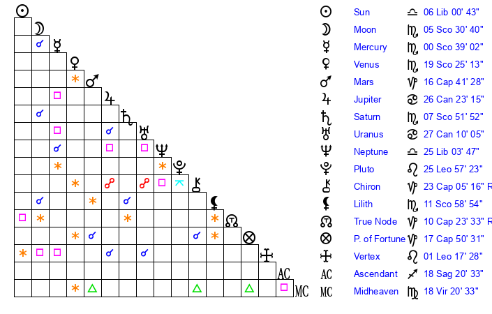 | Saturn | 8 Scorpio 20 | 27 Pisces 44 | 16 Scorpio 34 |