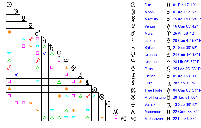 | Saturn | 21 Scorpio 36 | 19 Pisces 37 | 18 Scorpio 58 |