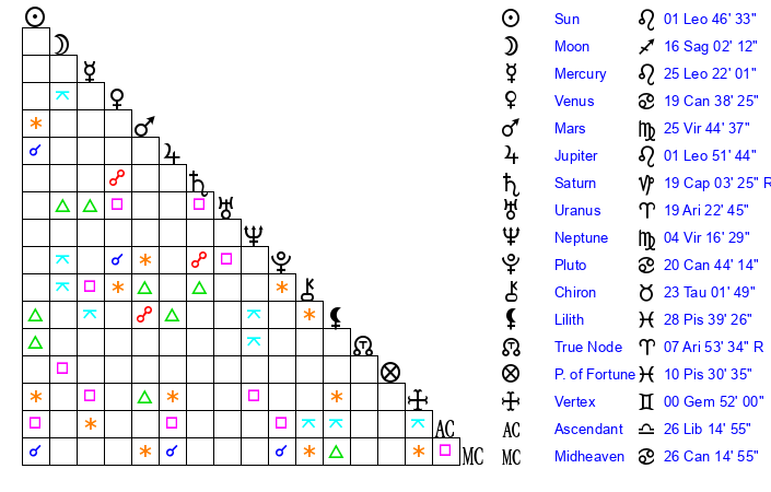 | Moon | 15 Sagittarius 59 | 14 Leo 26 | 15 Taurus 59 |
