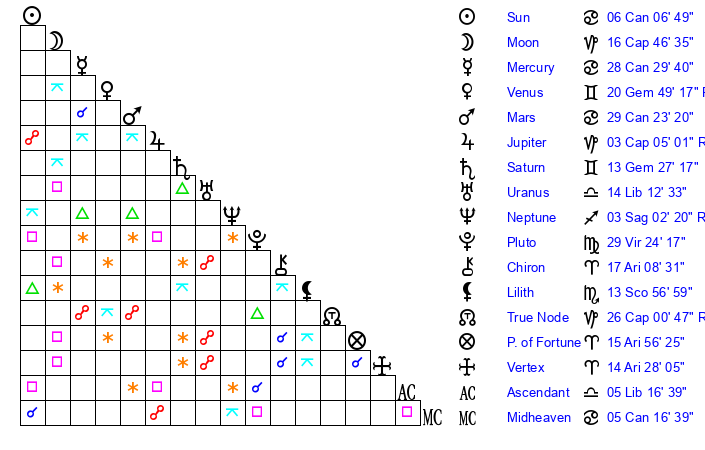 | Moon | 16 Capricorn 54 | 6 Leo 16 | 26 Sagittarius 8 |