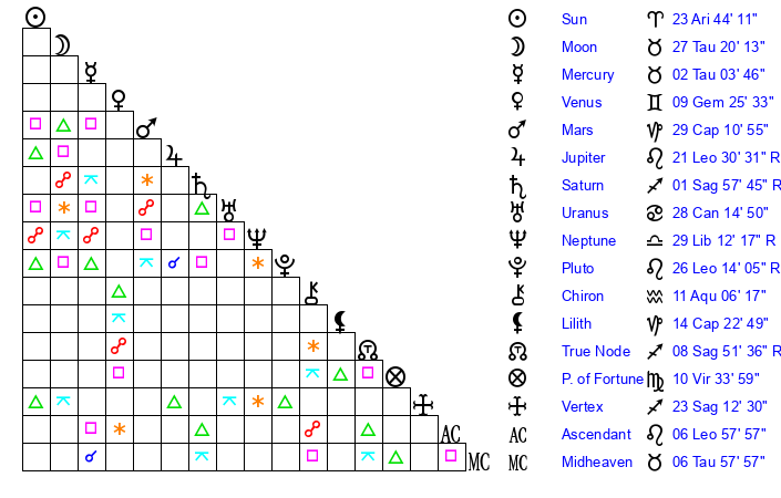 | Moon | 27 Taurus 23 | 1 Scorpio 27 | 13 Sagittarius 3 |