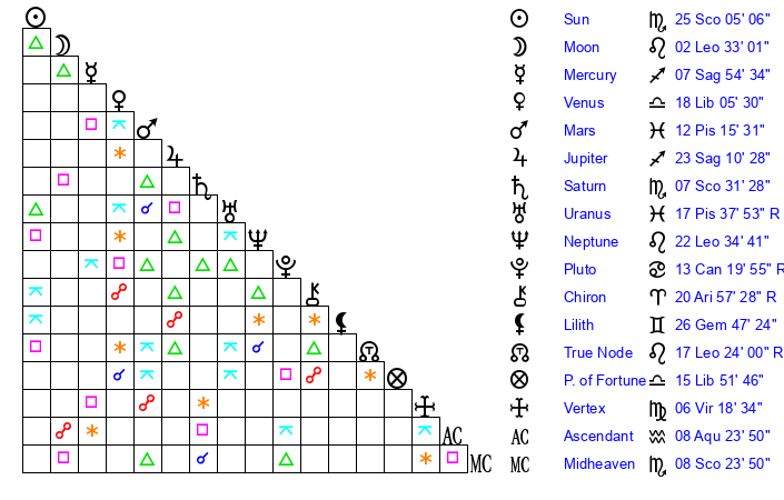 | Saturn | 8 Scorpio 2 | 25 Pisces 9 | 14 Scorpio 51 |