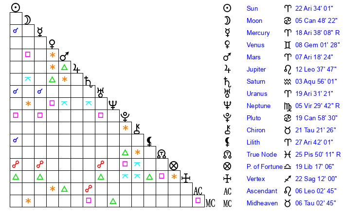 | Sun | 22 Aries 34 | 23 Aries 2 | 22 Cancer 0 |