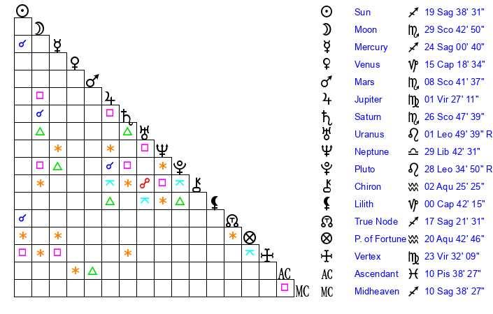 | Moon | 29 Scorpio 38 | 27 Virgo 22 | 14 Gemini 50 |
