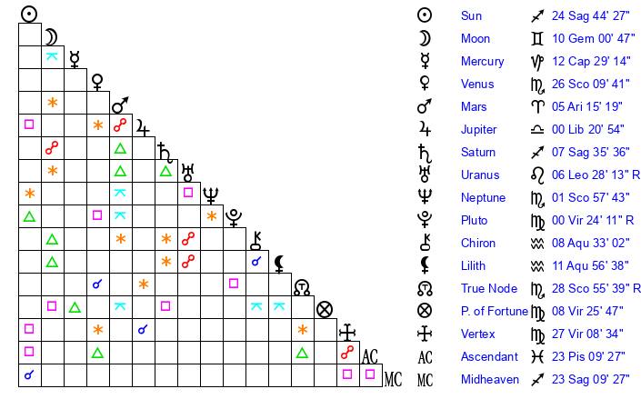| Moon | 10 Gemini 0 | 18 Scorpio 16 | 29 Sagittarius 41 |