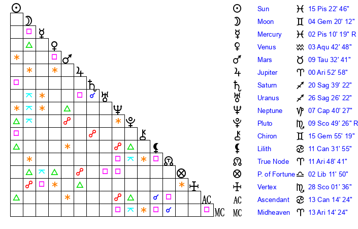 | Sun | 15 Pisces 23 | 16 Pisces 10 | 23 Aries 2 |